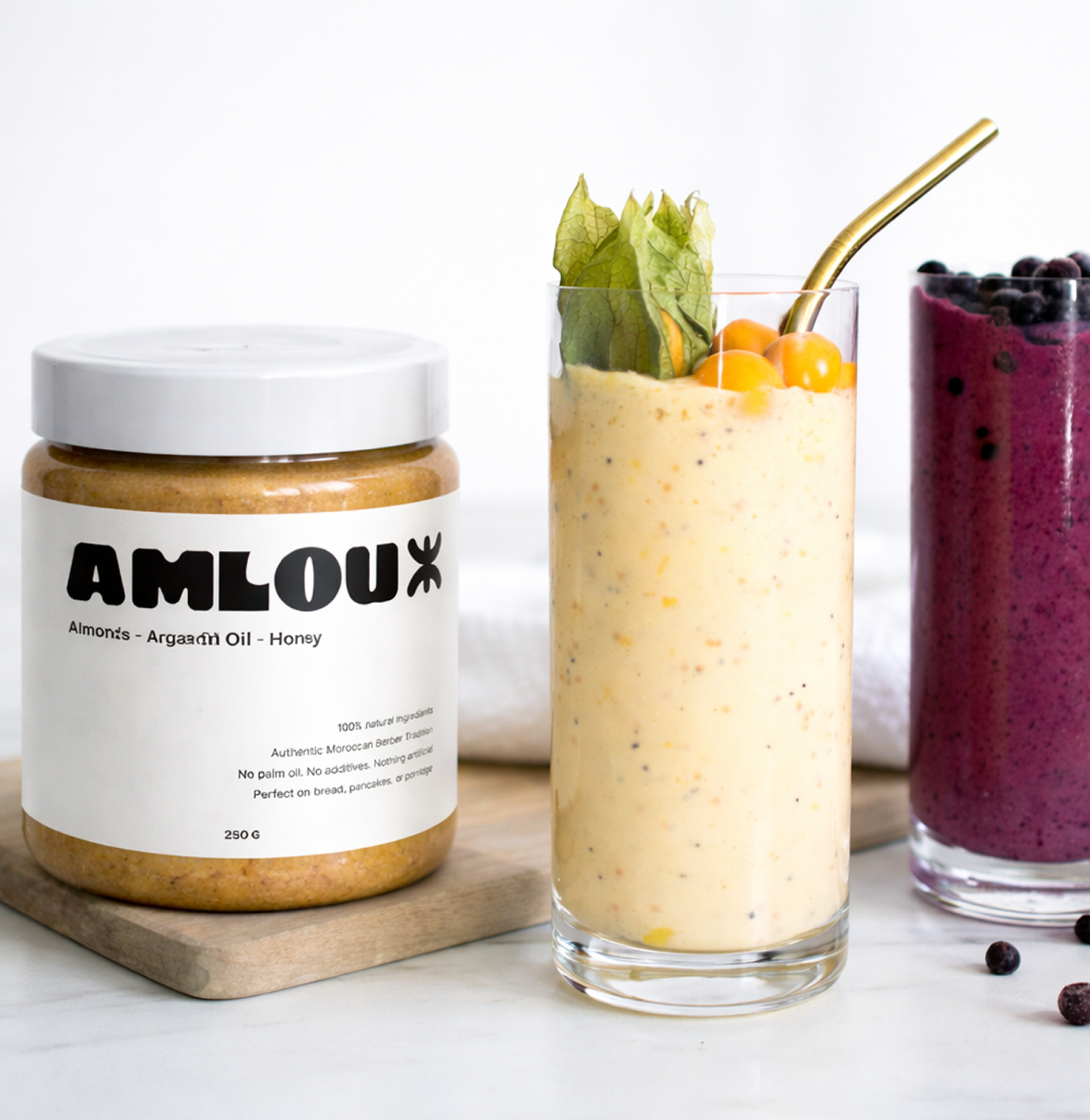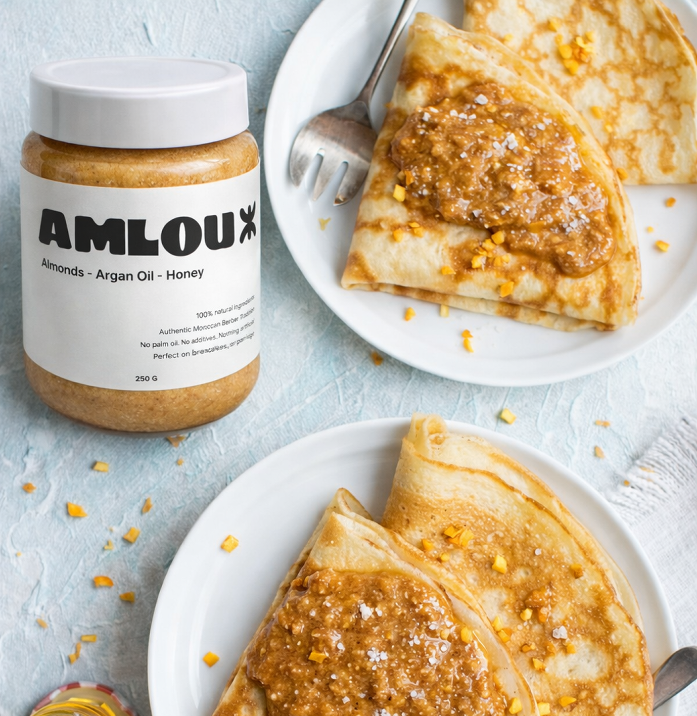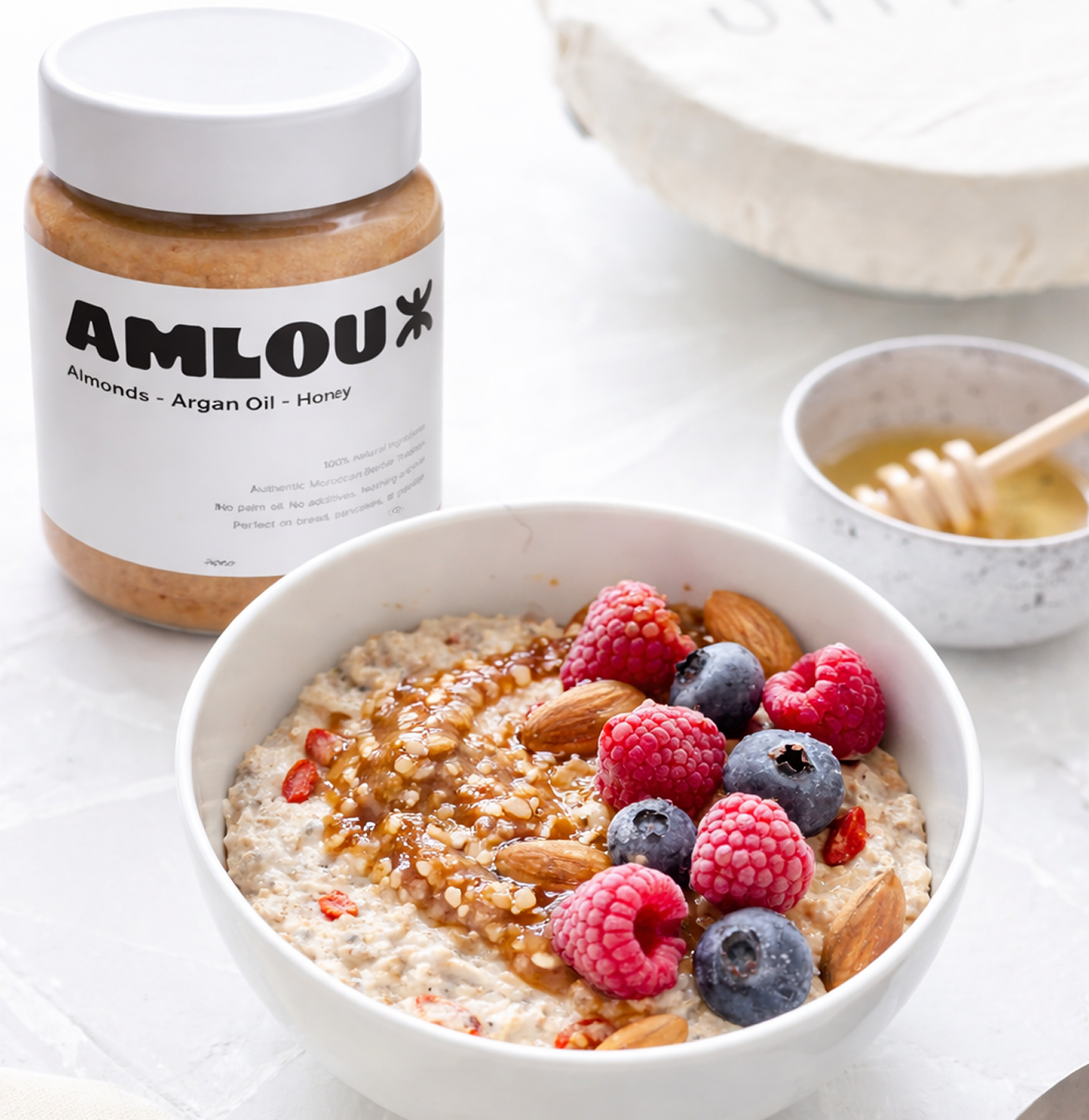 The original Amlou — a traditional blend of almonds, argan oil, and honey, rooted in Berber heritage. A timeless recipe from the Atlas Mountains, passed down through generations and kept pure in every jar.